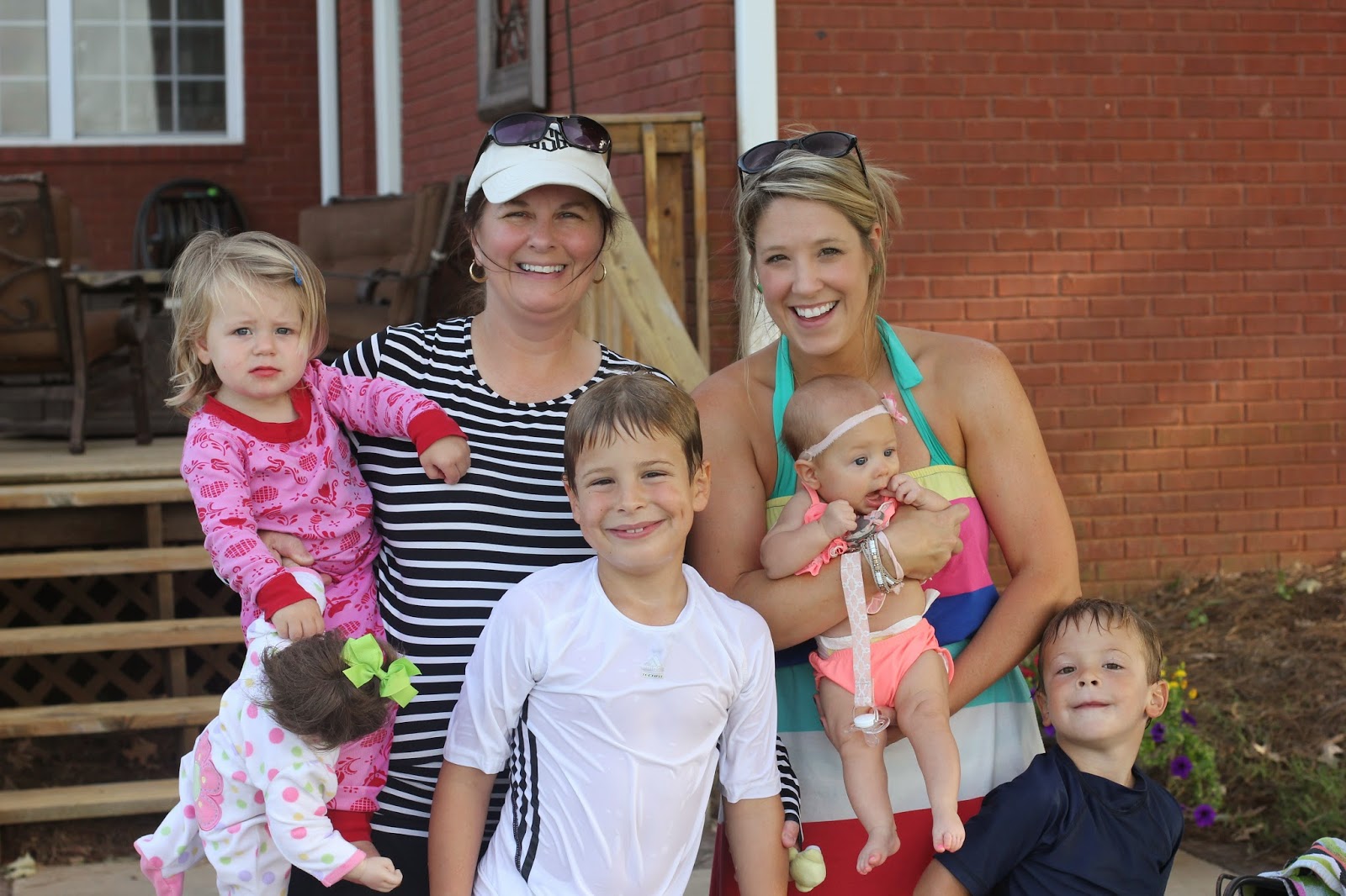 We also FINALLY visited Lake Conroe. Jason booked us a boat trip on a pontoon with our neighbors Joe and Peggy and the boys friend Matthew. It was a Saturday in August and it was sure to be a scorcher. When the day arrived, we packed enough food and drinks for a week along with towels and toys for a YMCA daycamp! Well, it just so happened to be the most perfect form of cloudy and cooler than most days in Texas ALL summer! The clouds were thick and threatened rain but it didn't rain, Not even once. It was a PERFECT day for taking 4 kids, newborn included out onto the lake. It was a little windy but no one seemed to mind. We ate all that we brought along and had mimosas to sip while on our little "three hour tour"! The boys would jump off one end of the boat, swim around, climb up, run through and do it all over again. I can't count how many times they did it! They had so much fun!